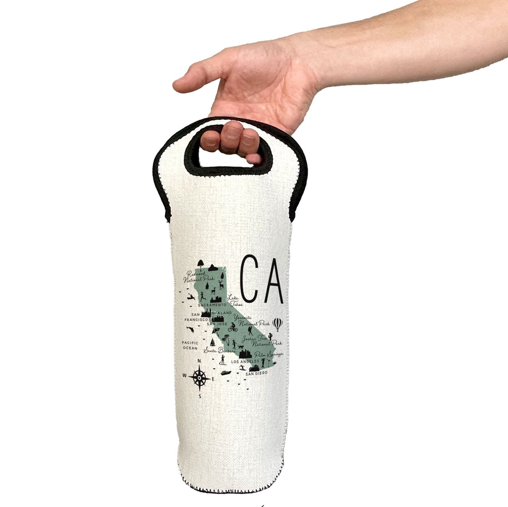 California state map with icons, printed on a faux linen bottle carrier with protective neoprene lining. Printed on both sides.