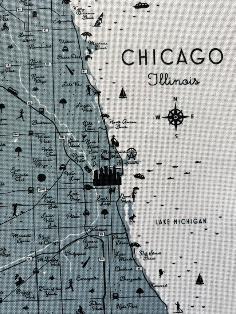 Chicago map art printed on white faux-linen polyester fabric. Designed and printed in our home studio.