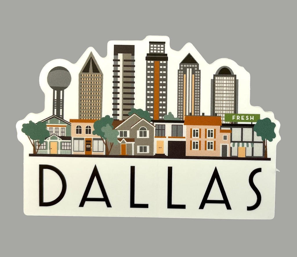 Dallas, TX Skyline Graphic die cut waterproof magnet with white background. Durable vinyl protects your magnet from sunlight, water, and scratches. Perfect for refrigerators, cars, lockers and more!