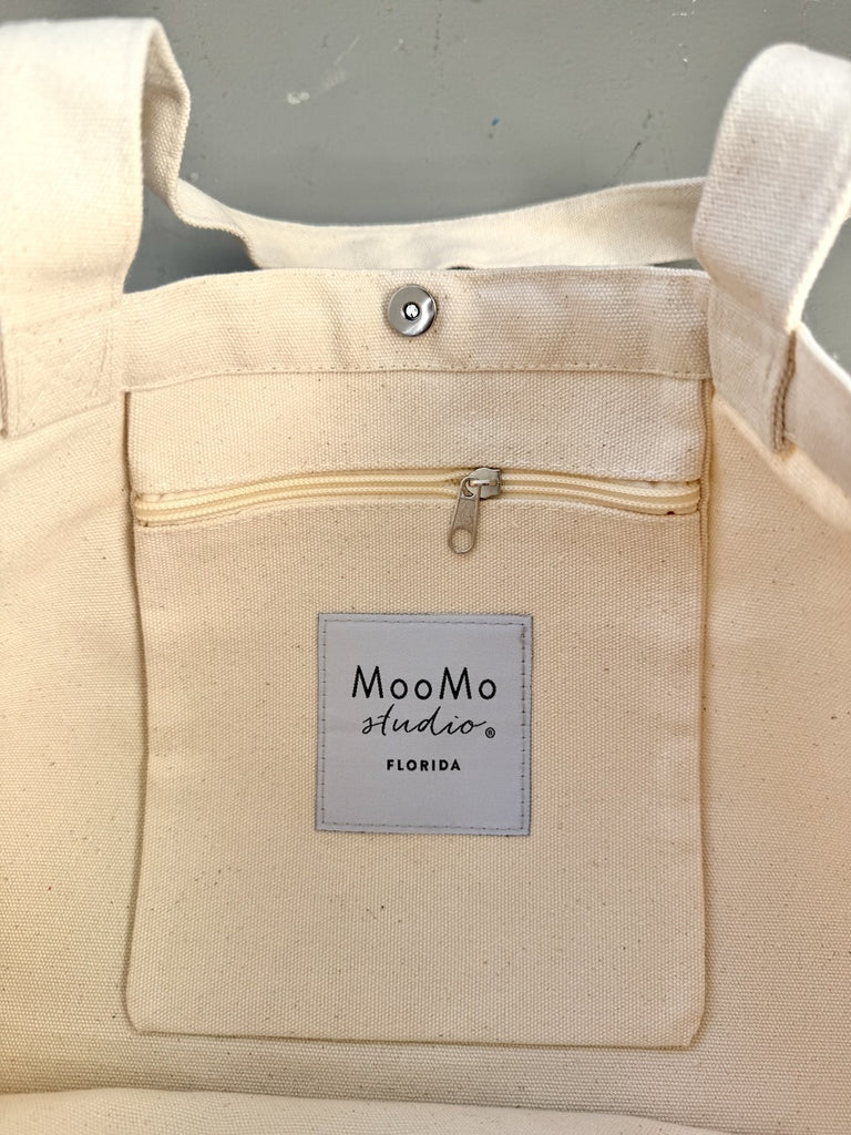 Florida Sunrise Map Collage thick, 14 oz. 100% cotton canvas tote bag with open front pocket and inside zipper pocket. Snap closure. Foldable and washable. Airlines’ personal item size!