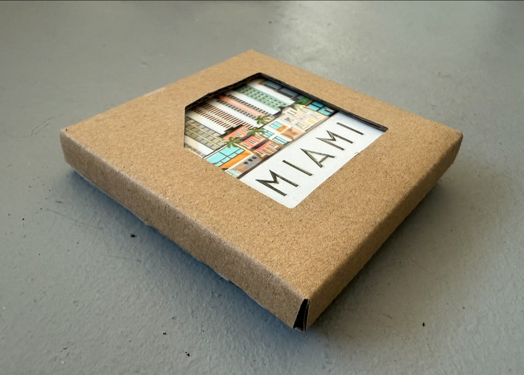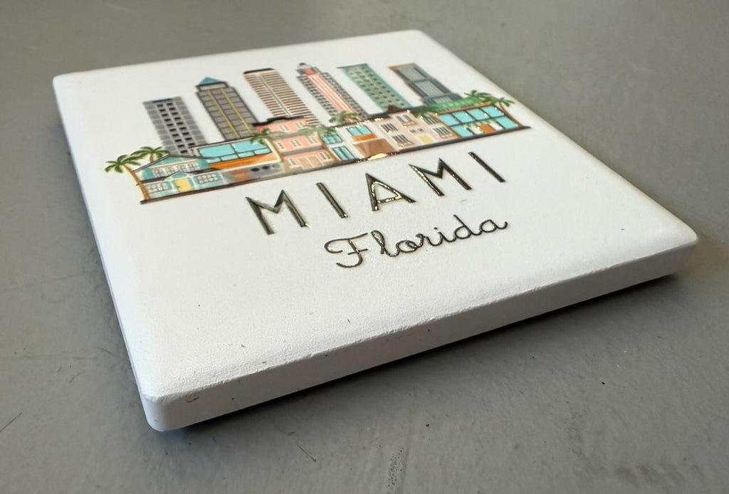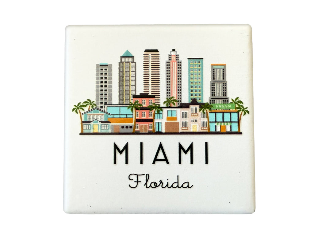 Miami, Florida Skyline Graphic ceramic magnet with white background. "4D" printing gives the design a raised, textured feel. Comes packaged in protective corrugated cardboard sleeve with viewing window.