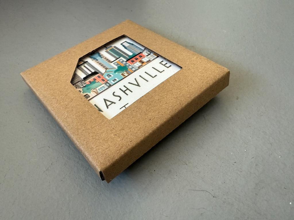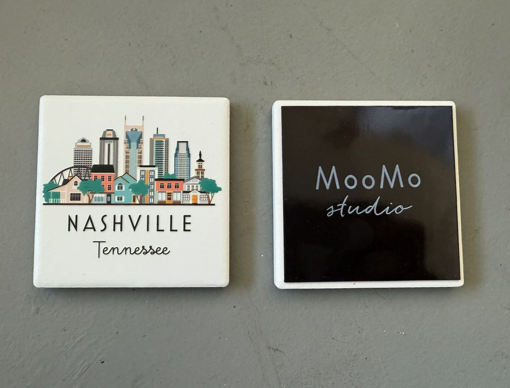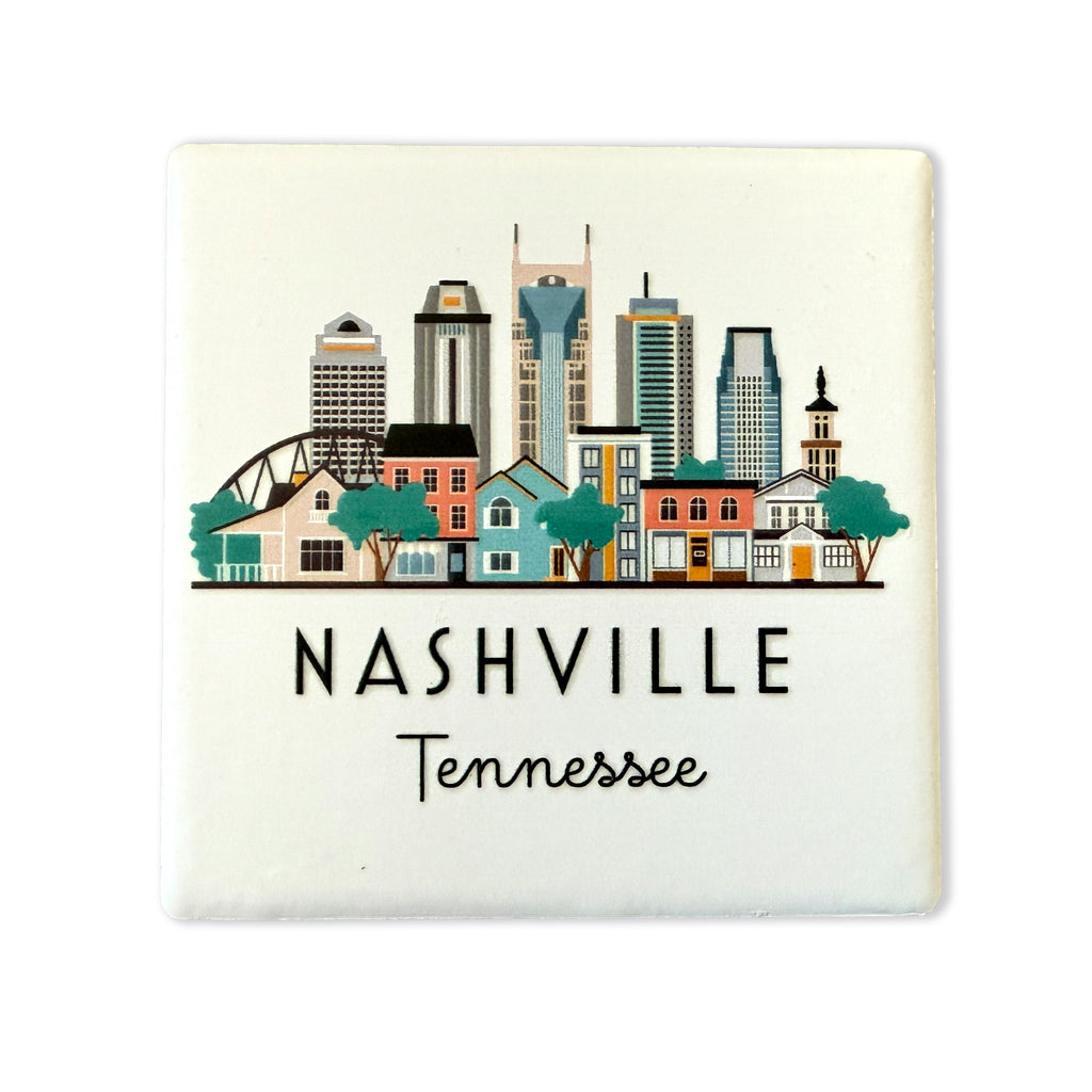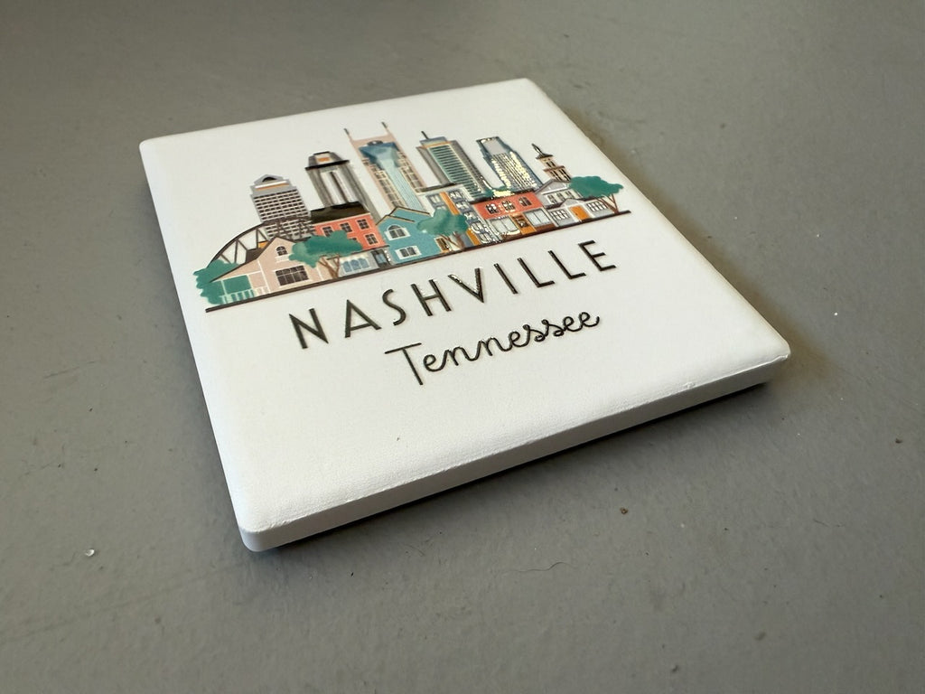 Nashville, Tennessee illustrated cityscape graphic skyline ceramic magnet with white background. "4D" printing gives the design a raised, textured feel. Comes packaged in protective corrugated cardboard sleeve with viewing window.