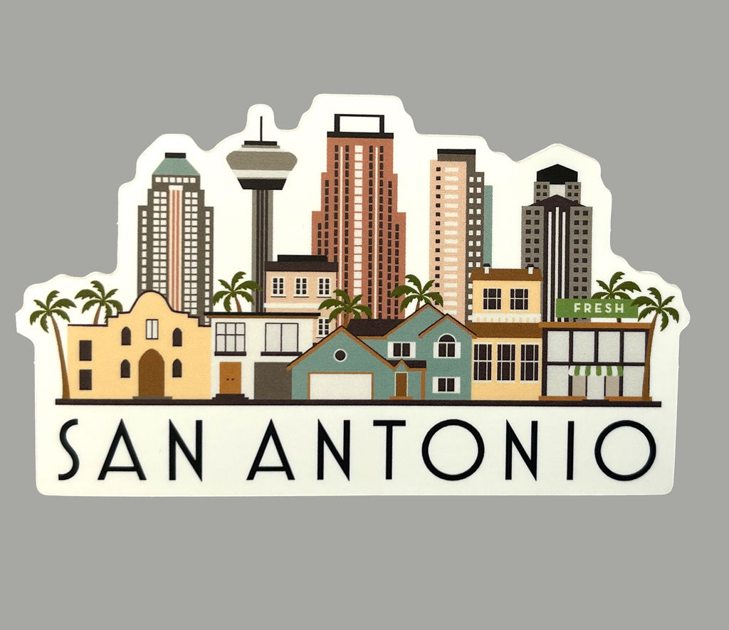 San Antonio, TX Skyline Graphic die cut waterproof magnet with white background. Durable vinyl protects your magnet from sunlight, water, and scratches. Perfect for refrigerators, cars, lockers and more!