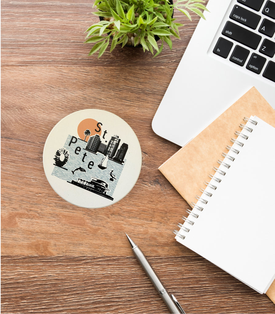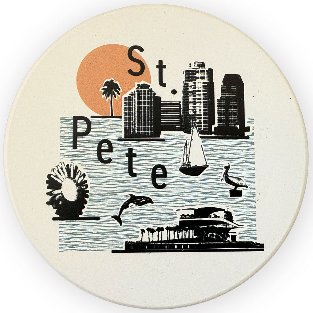 St. Pete, Florida collage cityscape graphic skyline. UV-Printed, very absorbent ceramic stone coaster with cork backing. Natural white background with matte finish