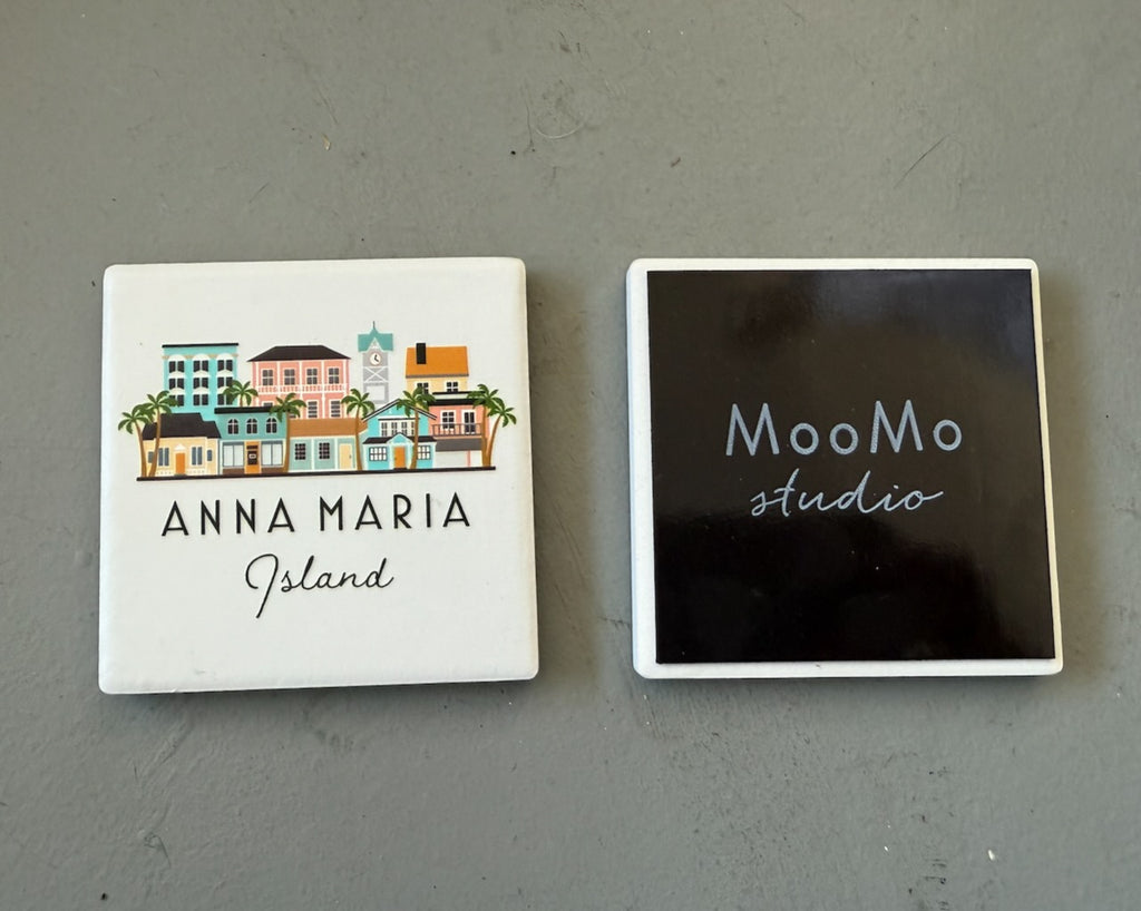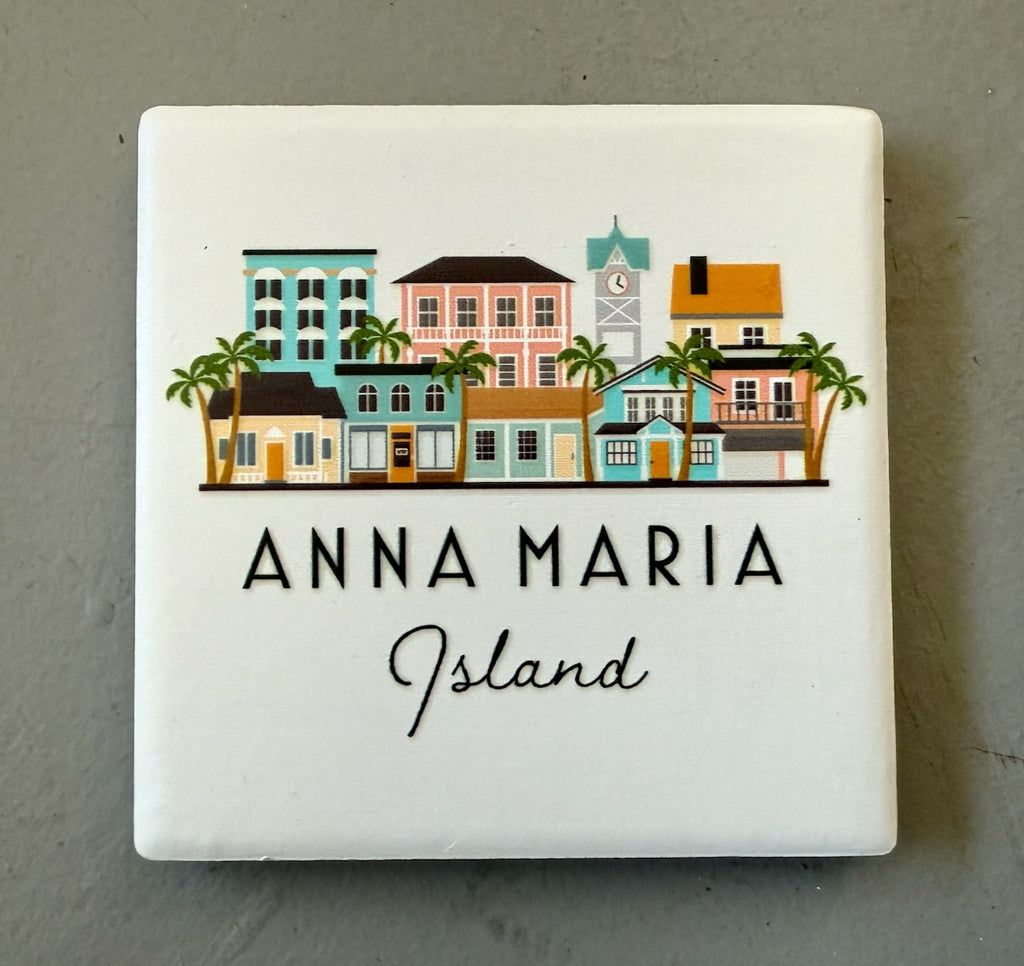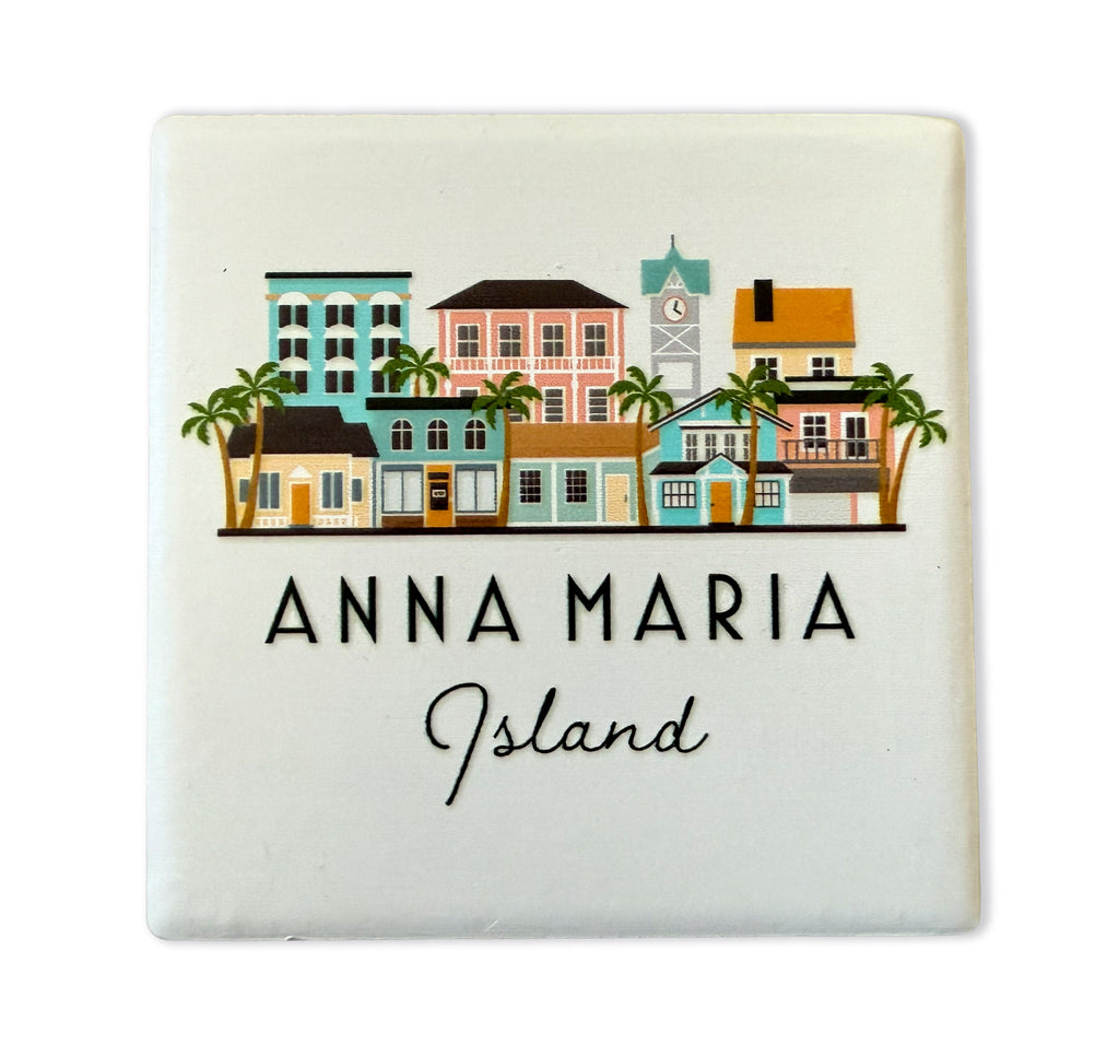 Anna Maria Island, Florida illustrated cityscape graphic skyline ceramic magnet with white background. "4D" printing gives the design a raised, textured feel. Comes packaged in protective corrugated cardboard sleeve with viewing window.