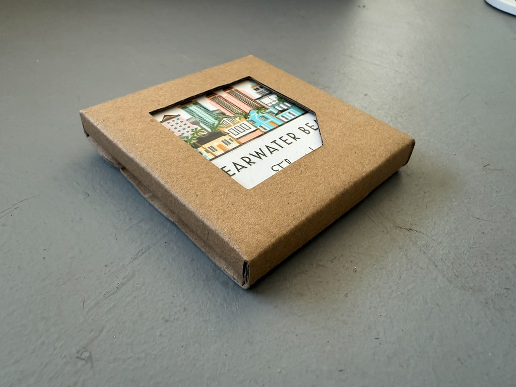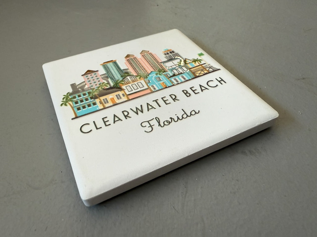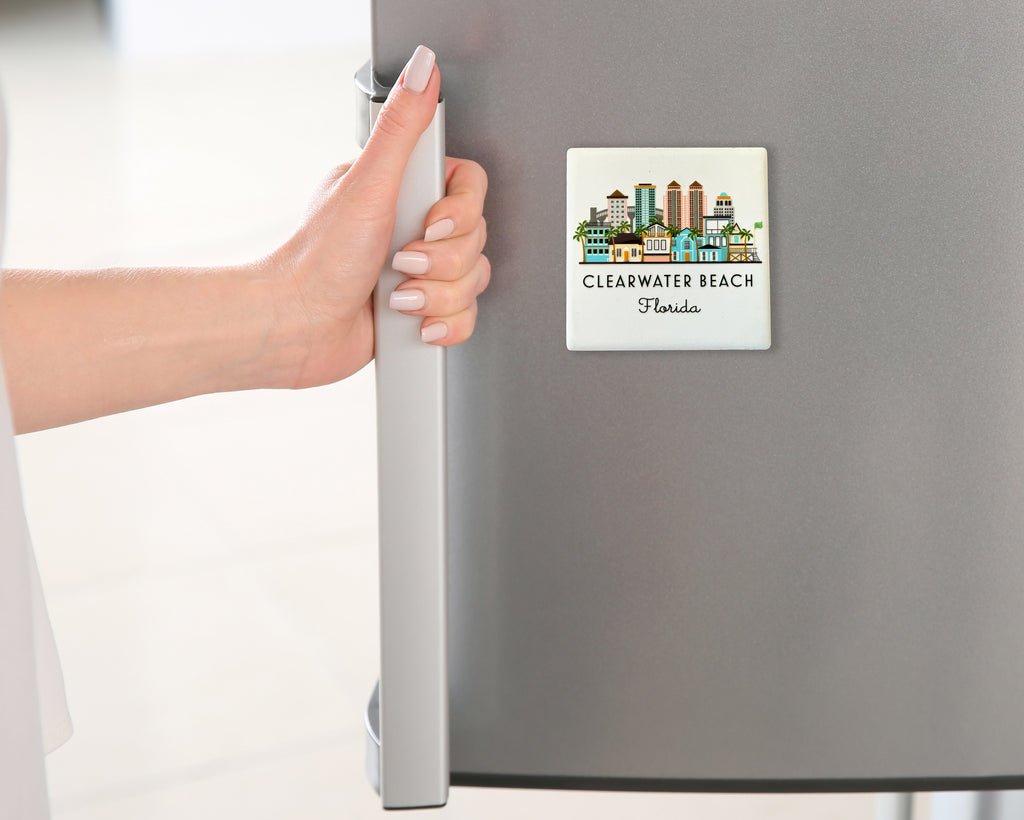 Clearwater Beach, Florida illustrated cityscape graphic skyline ceramic magnet with white background. "4D" printing gives the design a raised, textured feel. Comes packaged in protective corrugated cardboard sleeve with viewing window.