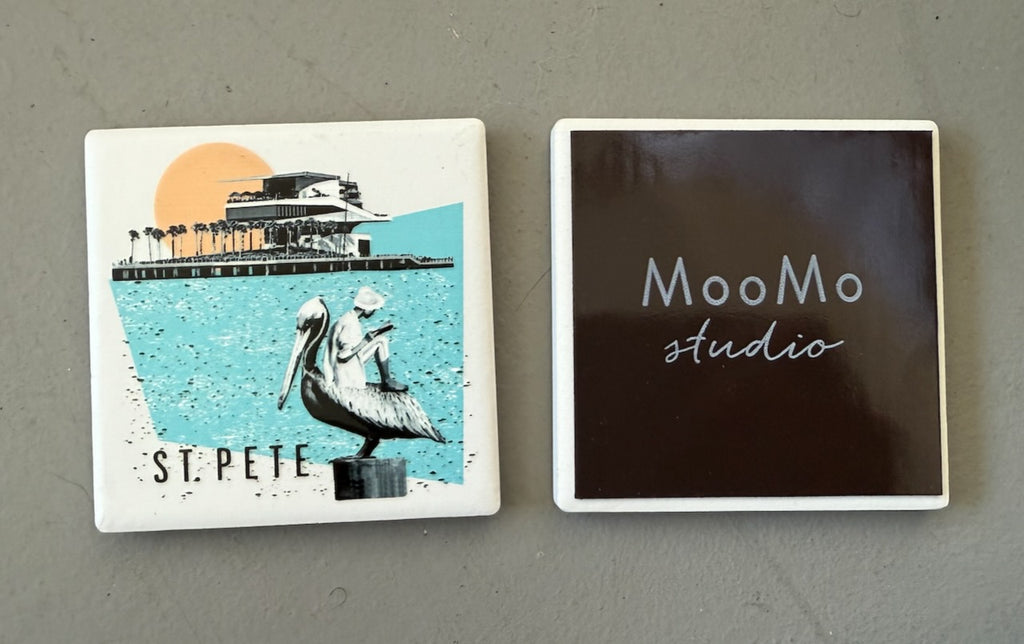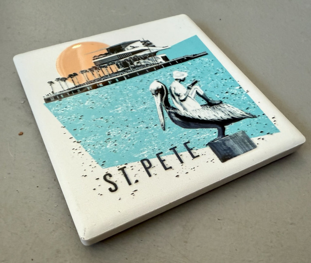 St. Pete Florida Pier collage ceramic magnet with white background. "4D" printing gives the design a raised, textured feel. Comes packaged in protective corrugated cardboard sleeve with viewing window.