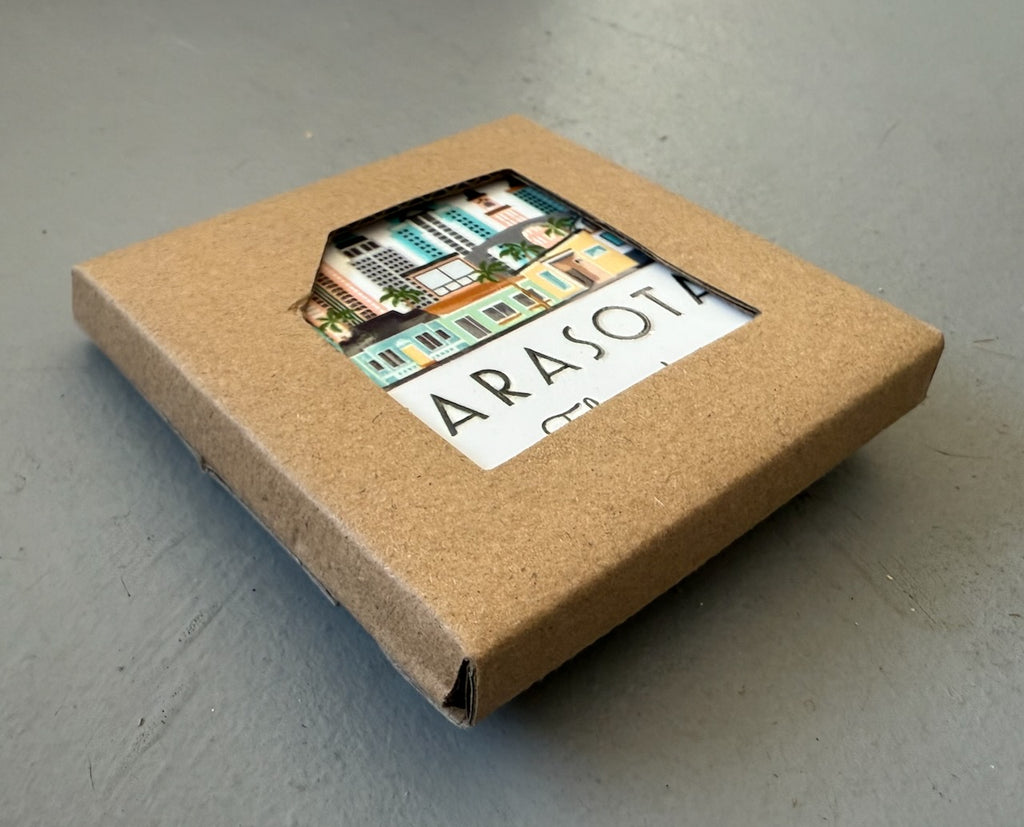 Sarasota, Florida illustrated cityscape graphic skyline ceramic magnet with white background. "4D" printing gives the design a raised, textured feel. Comes packaged in protective corrugated cardboard sleeve with viewing window.