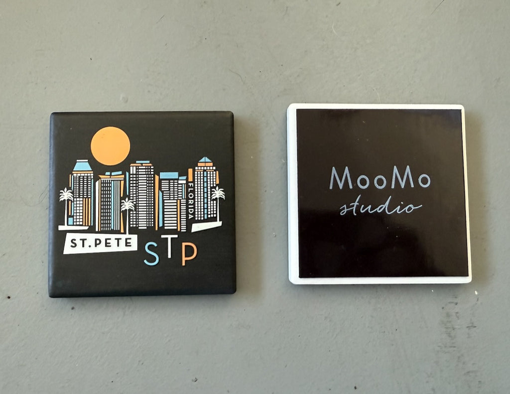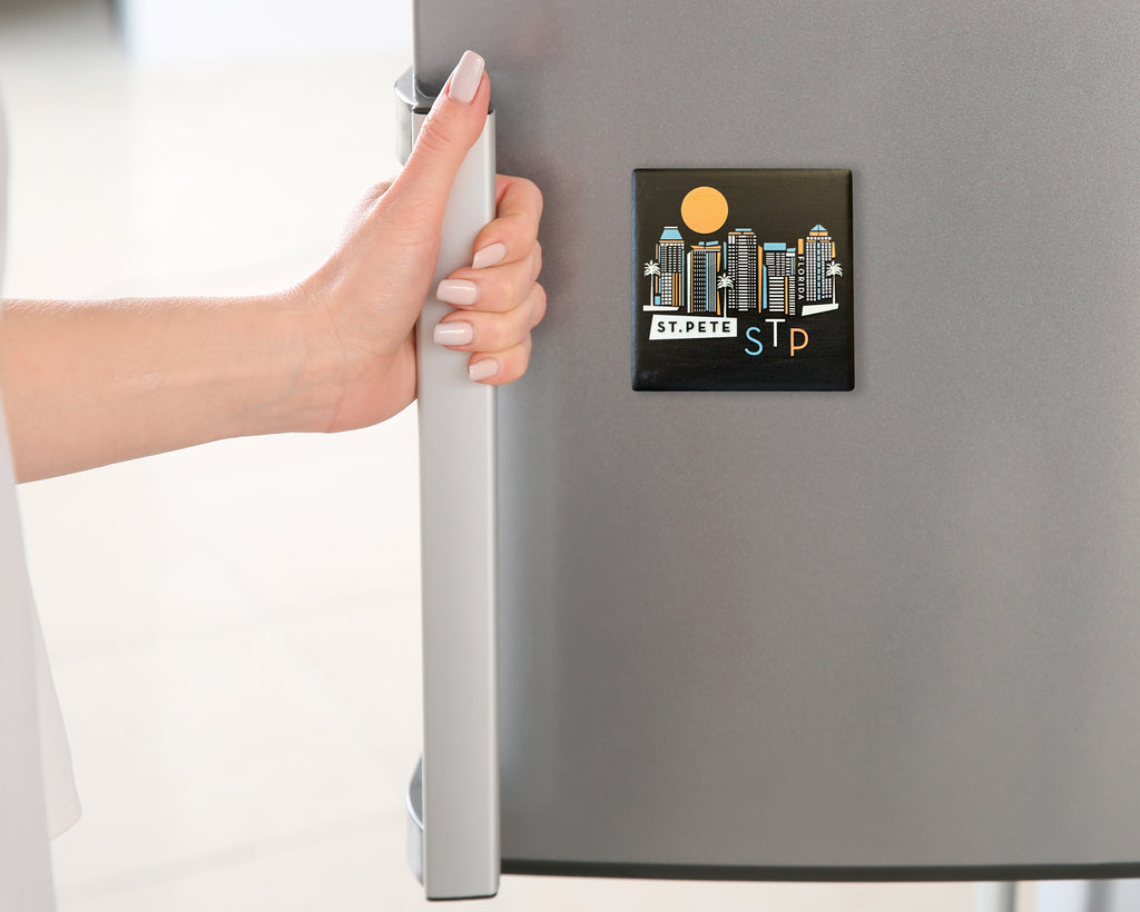 St. Pete, Florida geometric graphic skyline ceramic magnet with black background. "4D" printing gives the design a raised, textured feel. Comes packaged in protective corrugated cardboard sleeve with viewing window.