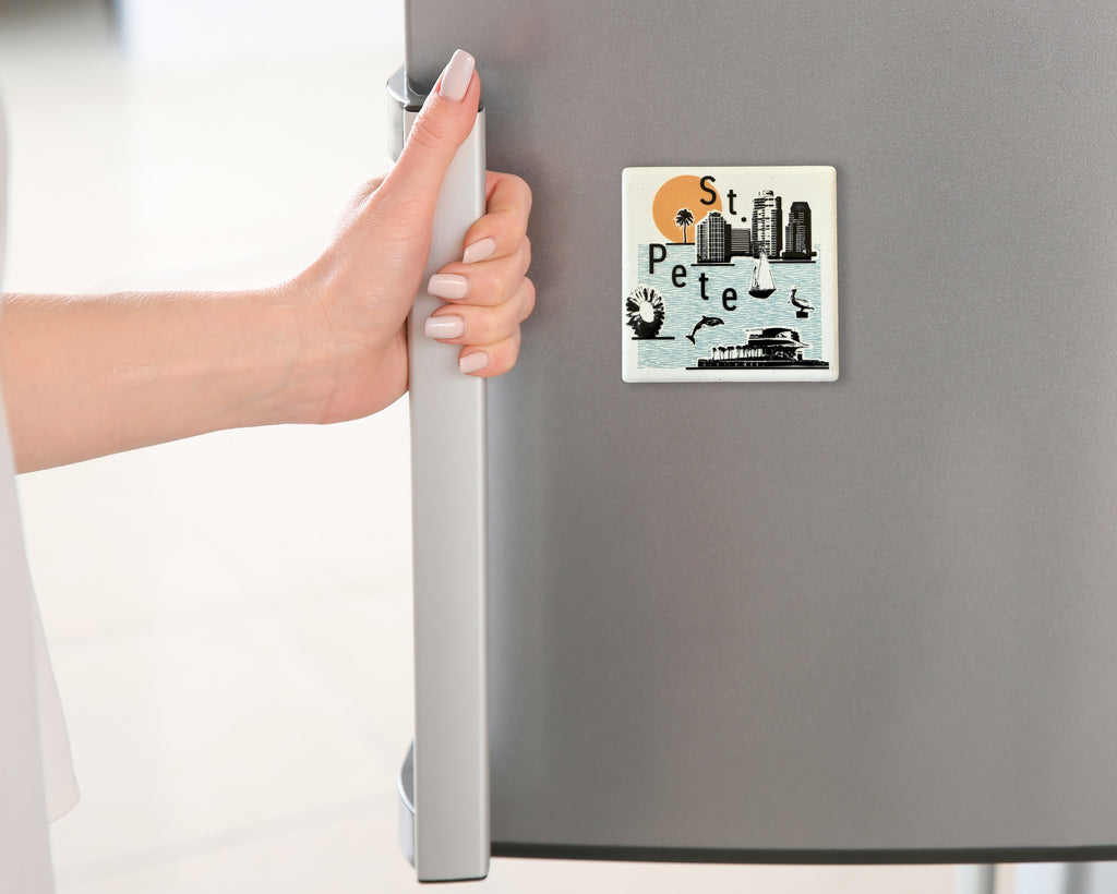 St. Pete, Florida collage cityscape graphic skyline ceramic magnet with white background. "4D" printing gives the design a raised, textured feel. Comes packaged in protective corrugated cardboard sleeve with viewing window.
