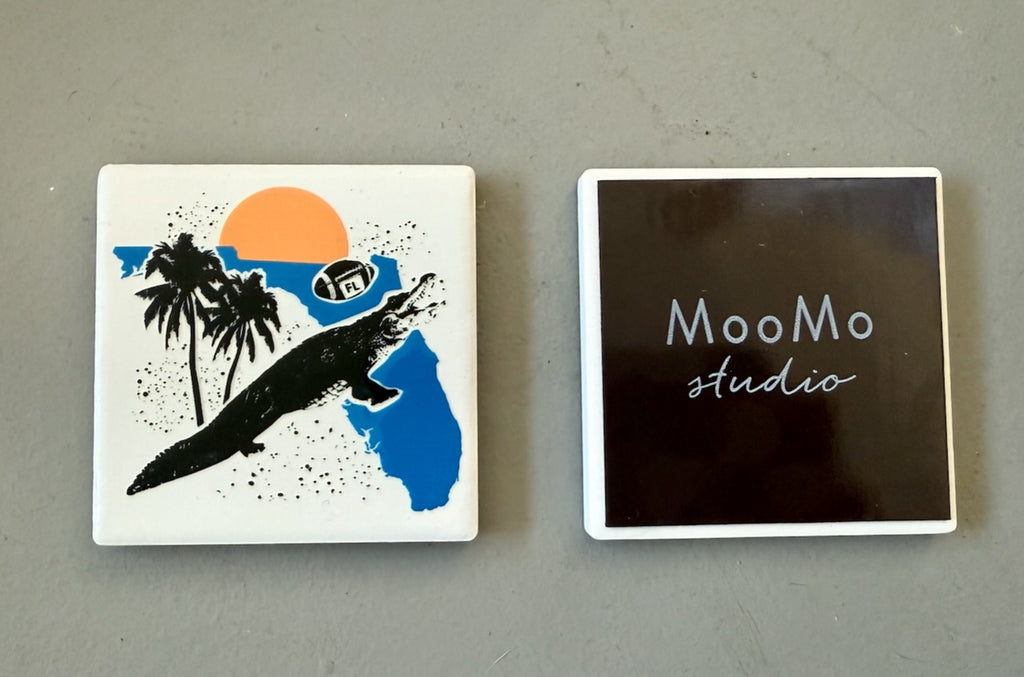 Florida Alligator Football Collage ceramic magnet with white background. "4D" printing gives the design a raised, textured feel. Comes packaged in protective corrugated cardboard sleeve with viewing window.
