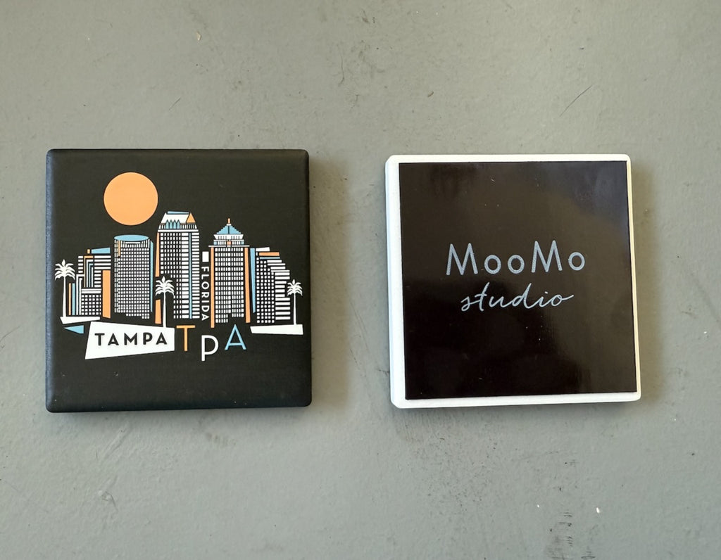 Tampa, Florida geometric graphic skyline ceramic magnet with black background. "4D" printing gives the design a raised, textured feel. Comes packaged in protective corrugated cardboard sleeve with viewing window.