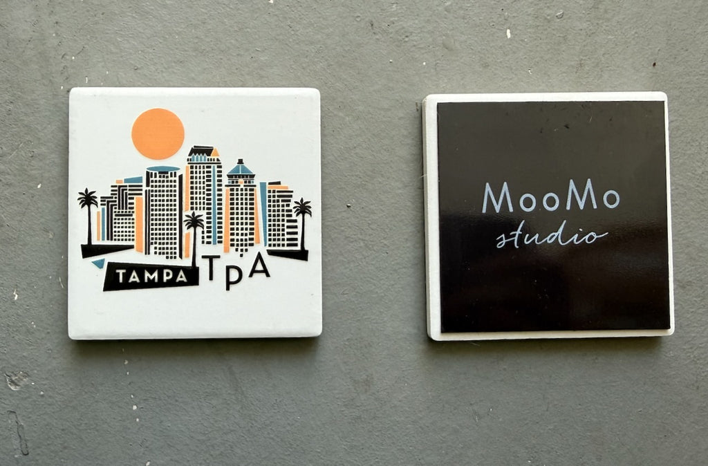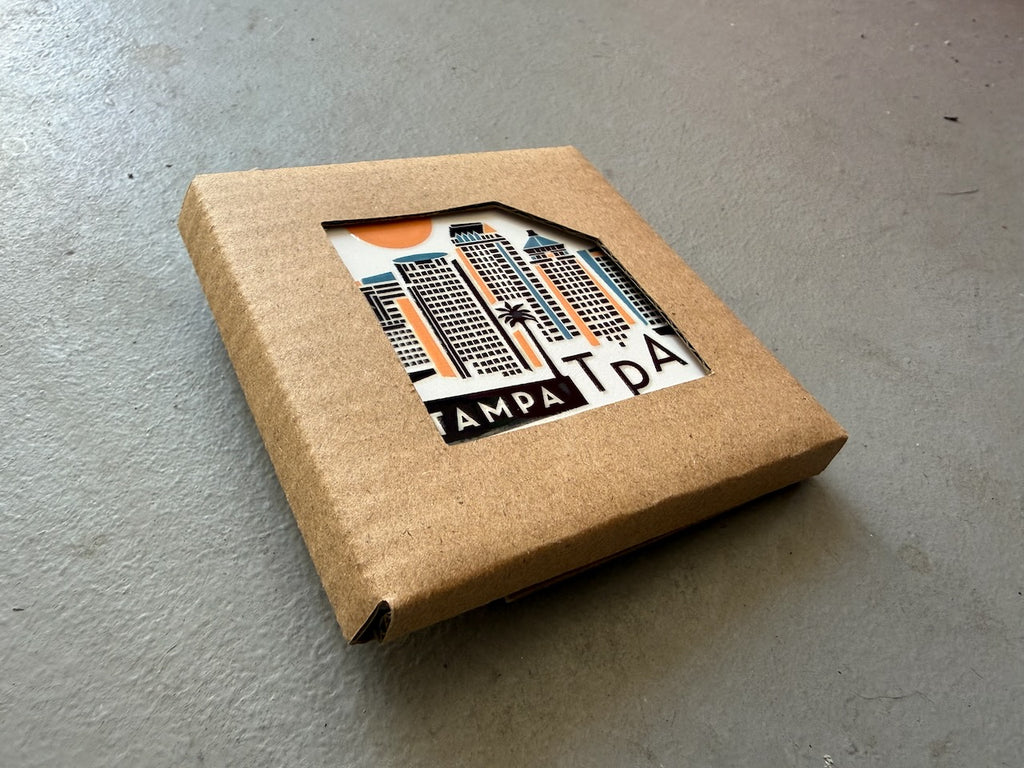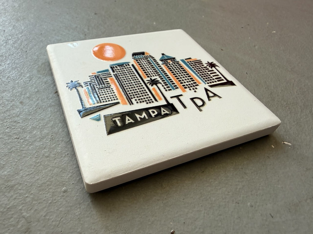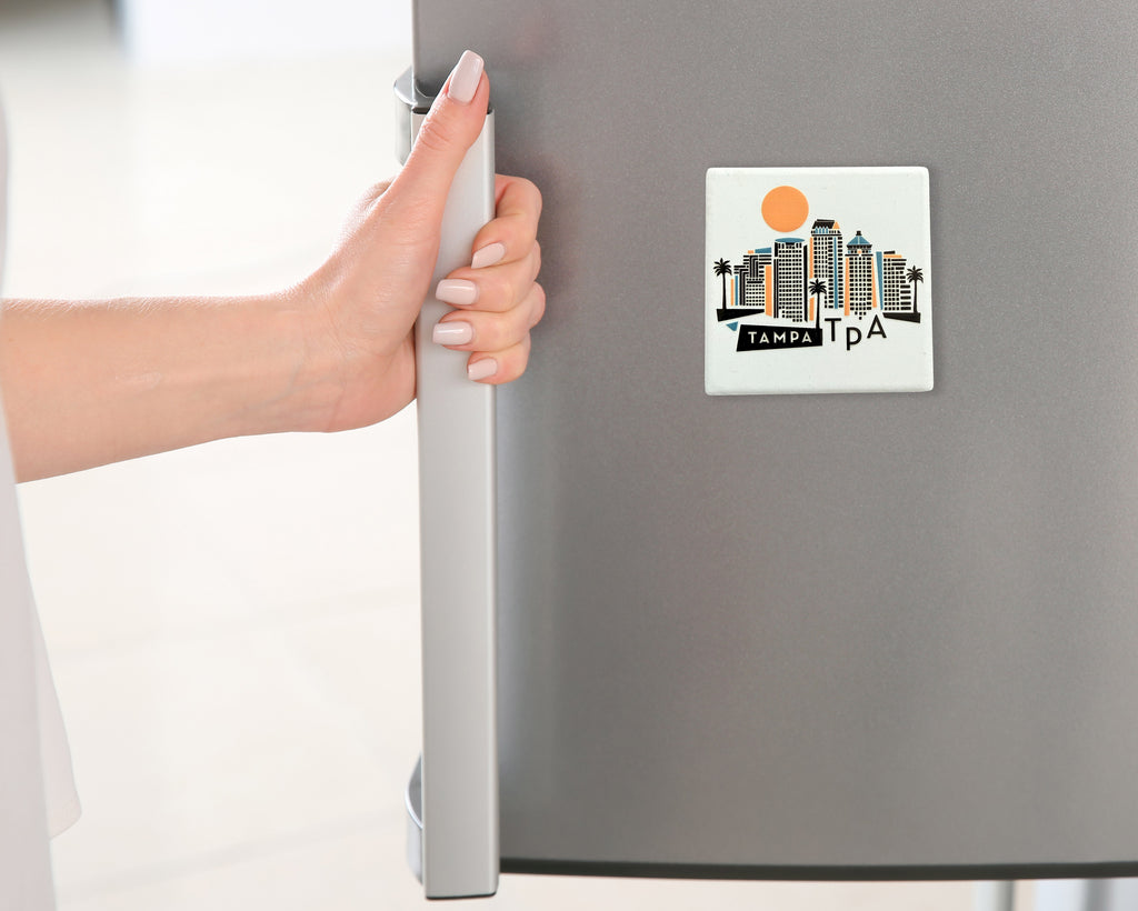 Tampa, Florida geometric graphic skyline ceramic magnet with white background. "4D" printing gives the design a raised, textured feel. Comes packaged in protective corrugated cardboard sleeve with viewing window.