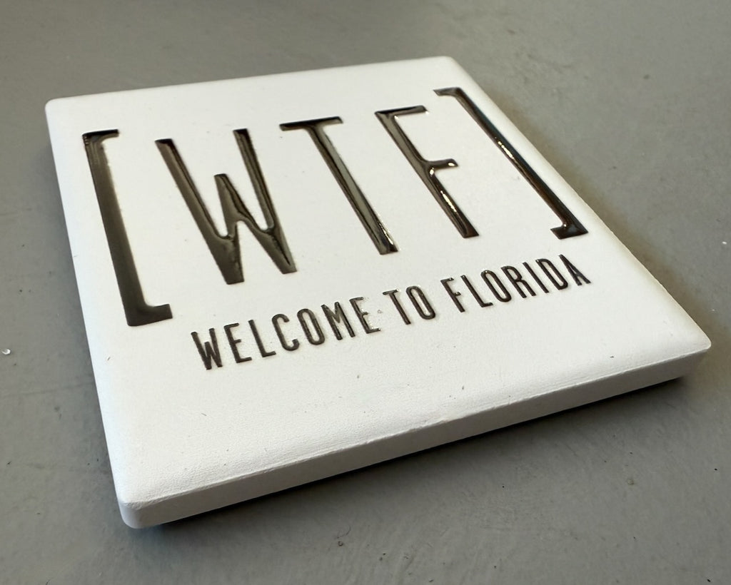WTF Welcome To Florida ceramic magnet with white background. "4D" printing gives the design a raised, textured feel. Comes packaged in protective corrugated cardboard sleeve with viewing window.