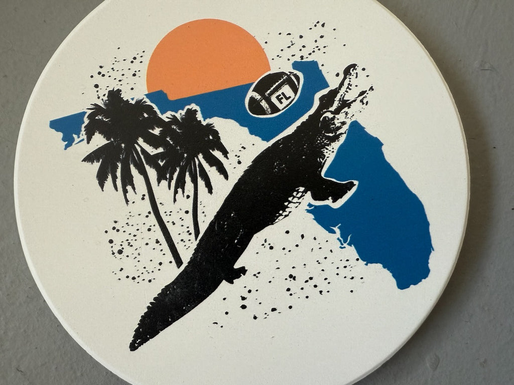 Florida Gators Football, UV-Printed absorbent ceramic coaster with cork backing. Natural white background with matte finish