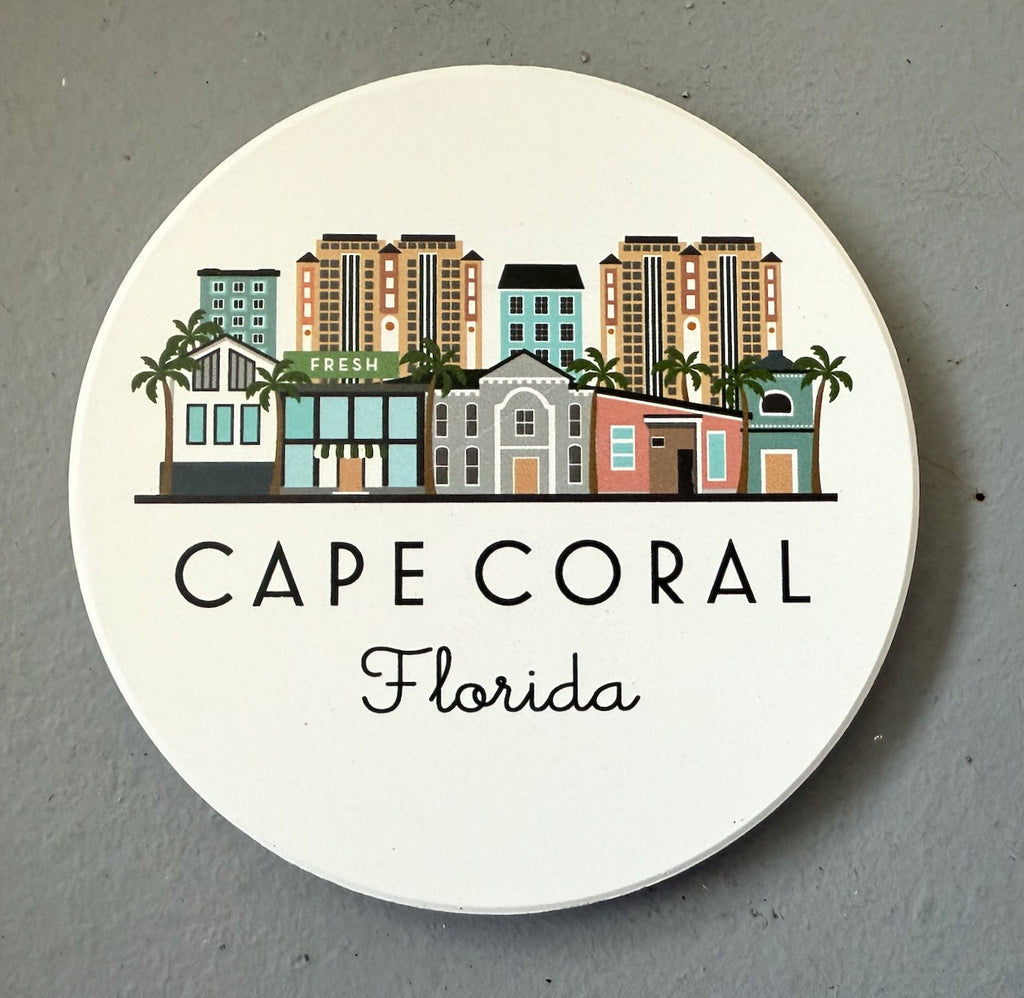Cape Coral, Florida geometric graphic skyline. UV-Printed, very absorbent ceramic stone coaster with cork backing. Natural white background with matte finish