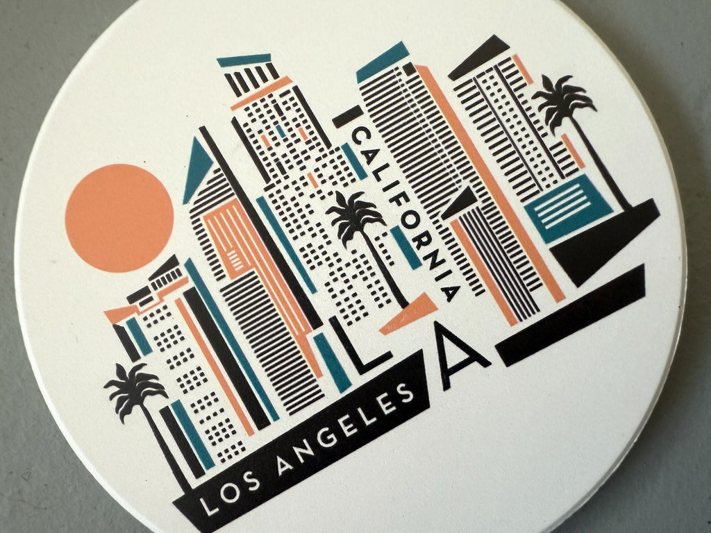 Los Angeles, California geometric graphic skyline. UV-Printed, very absorbent ceramic stone coaster with cork backing. Natural white background with matte finish