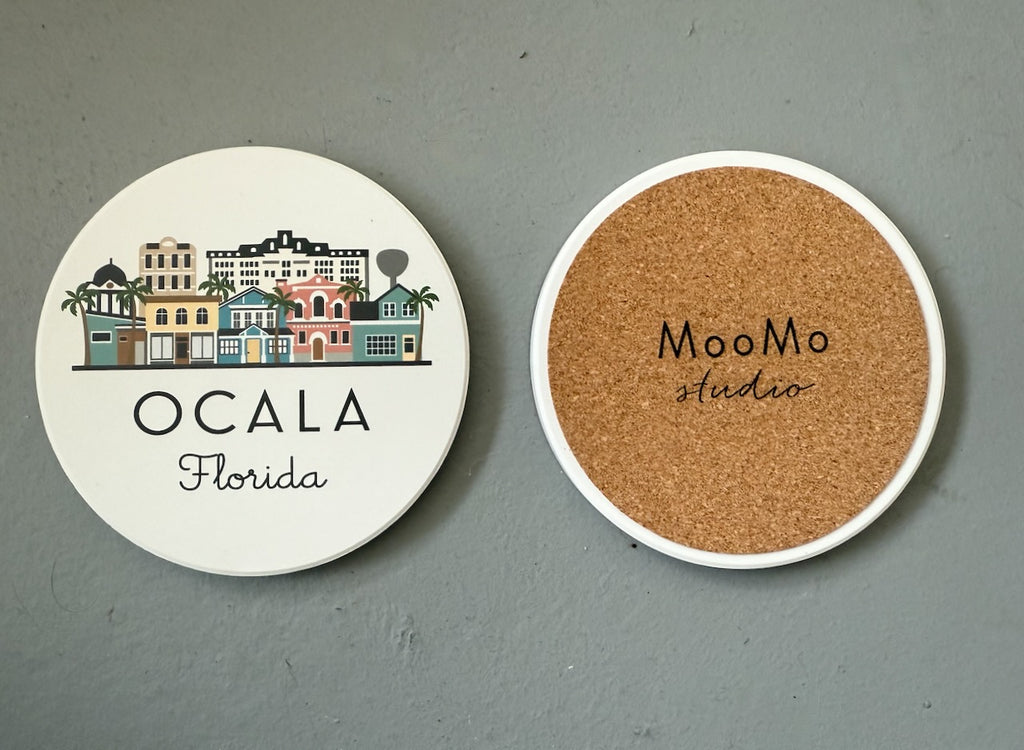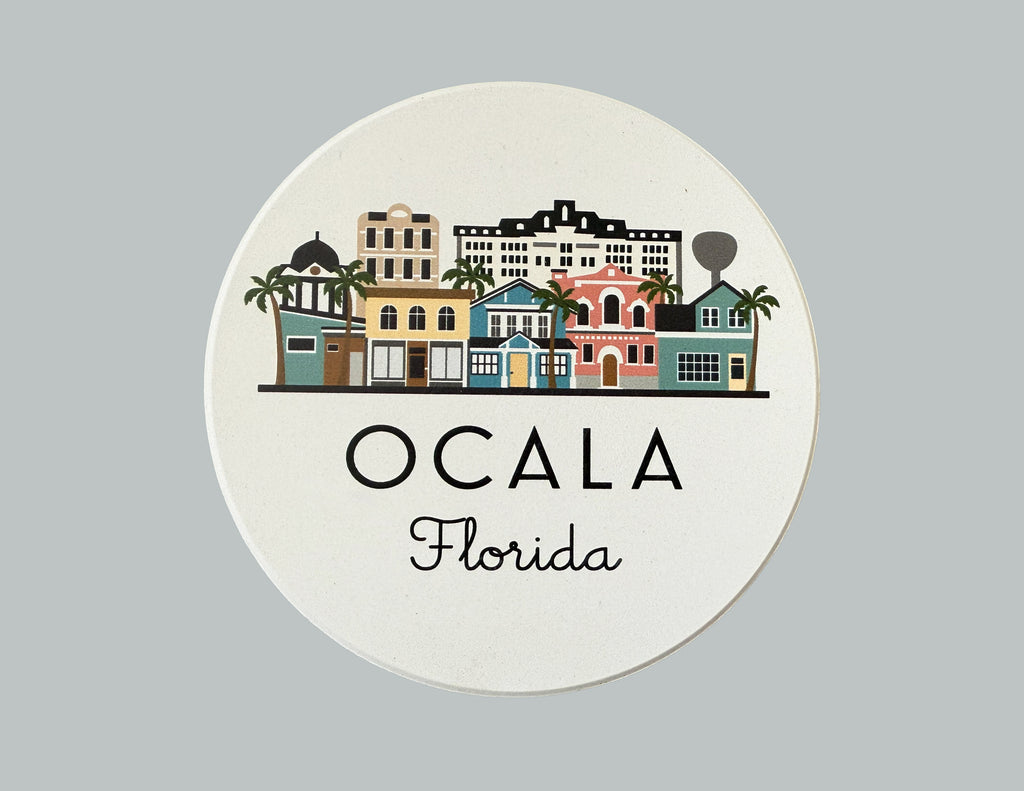 Ocala, Florida illustrated coaster. UV-Printed, very absorbent ceramic stone coaster with cork backing. Natural white background with matte finish