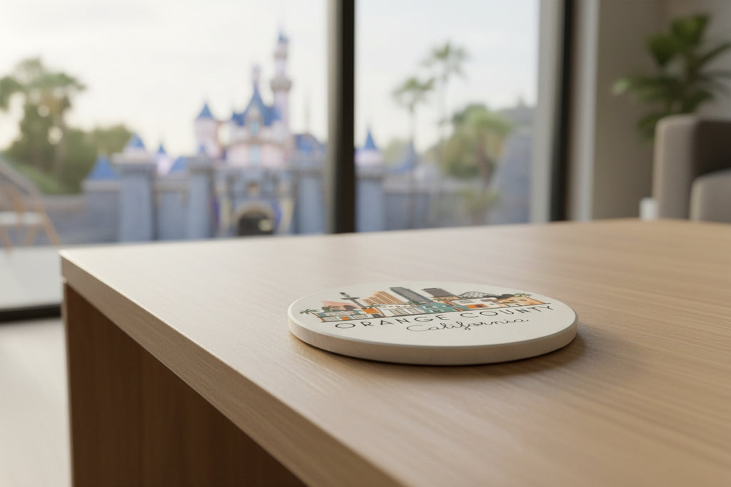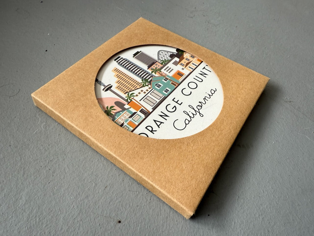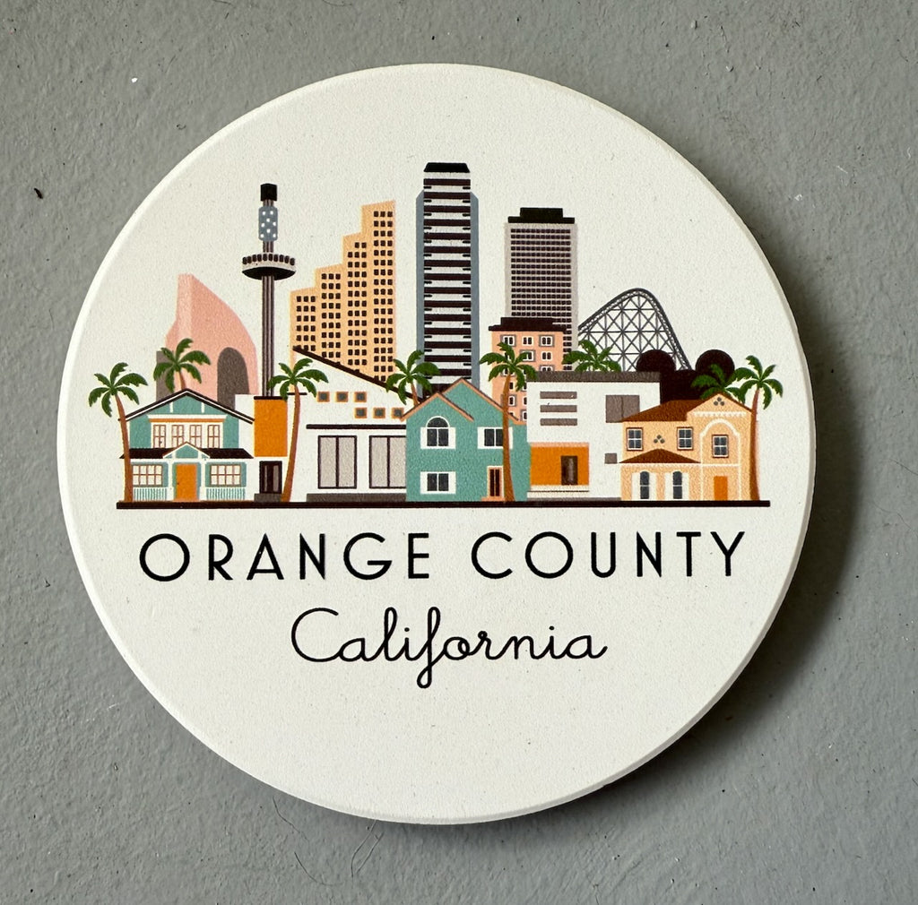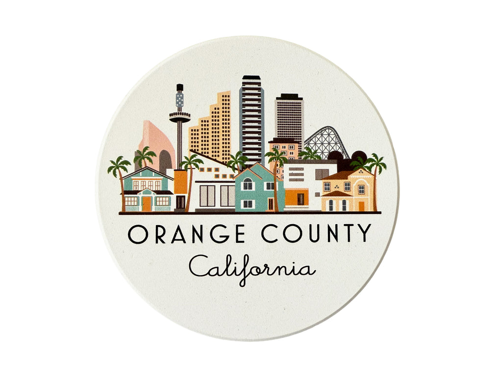 Orange County, California illustrated graphic coaster. UV-Printed, very absorbent ceramic stone coaster with cork backing. Natural white background with matte finish