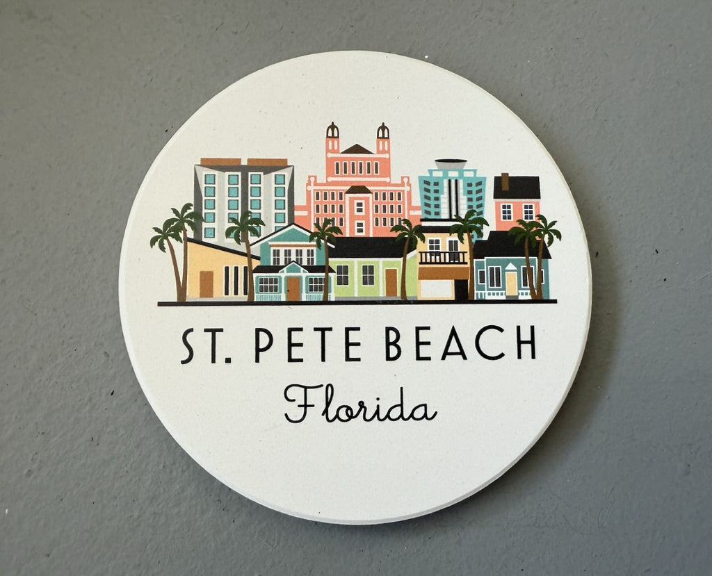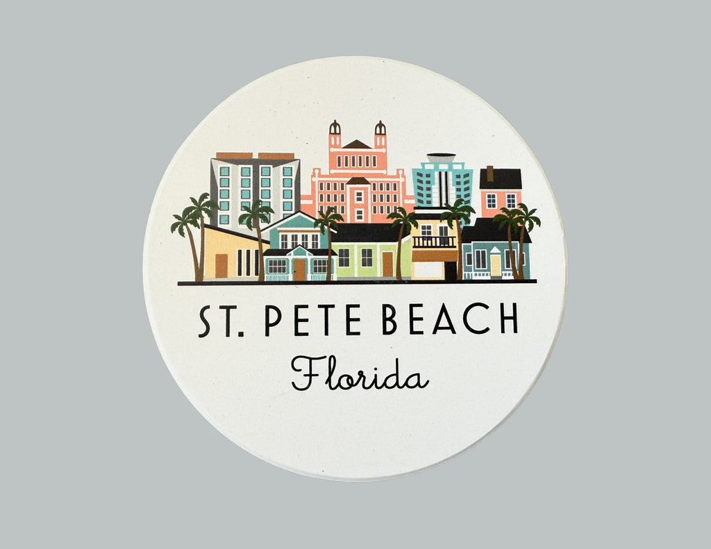 St. Pete Beach, Florida illustrated cityscape graphic skyline. UV-Printed, very absorbent ceramic stone coaster with cork backing. Natural white background with matte finish