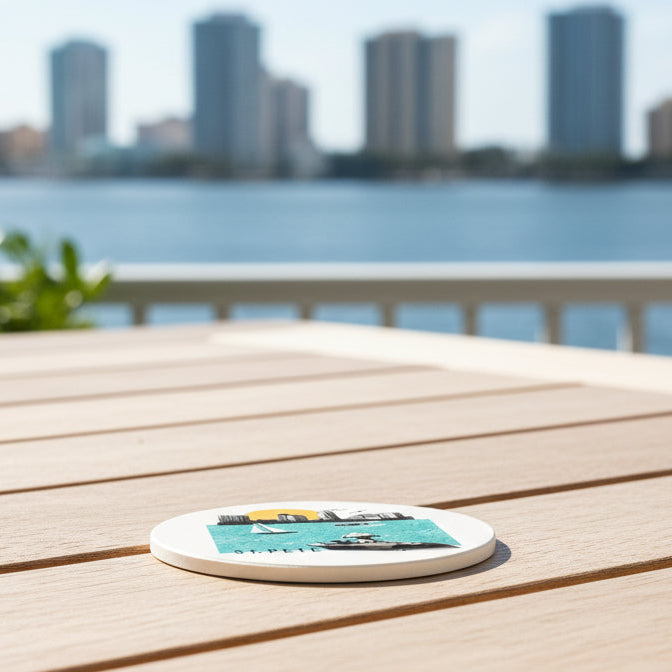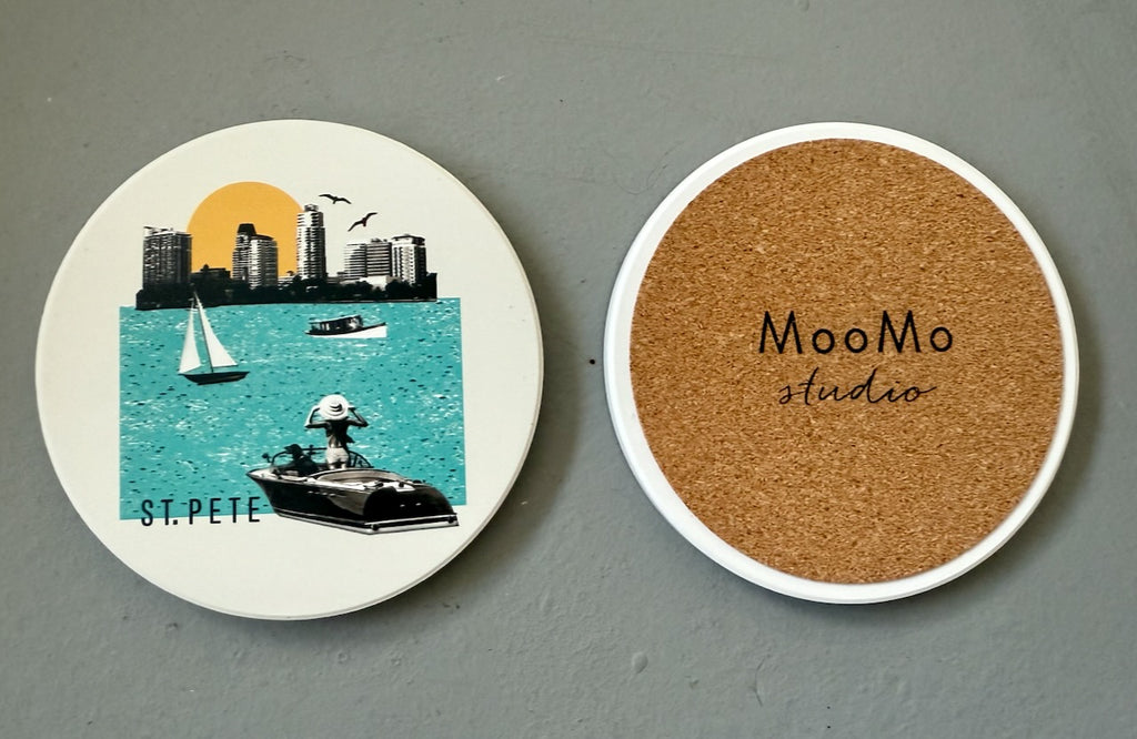 St. Pete, Florida boat collage cityscape graphic skyline. UV-Printed, very absorbent ceramic stone coaster with cork backing. Natural white background with matte finish