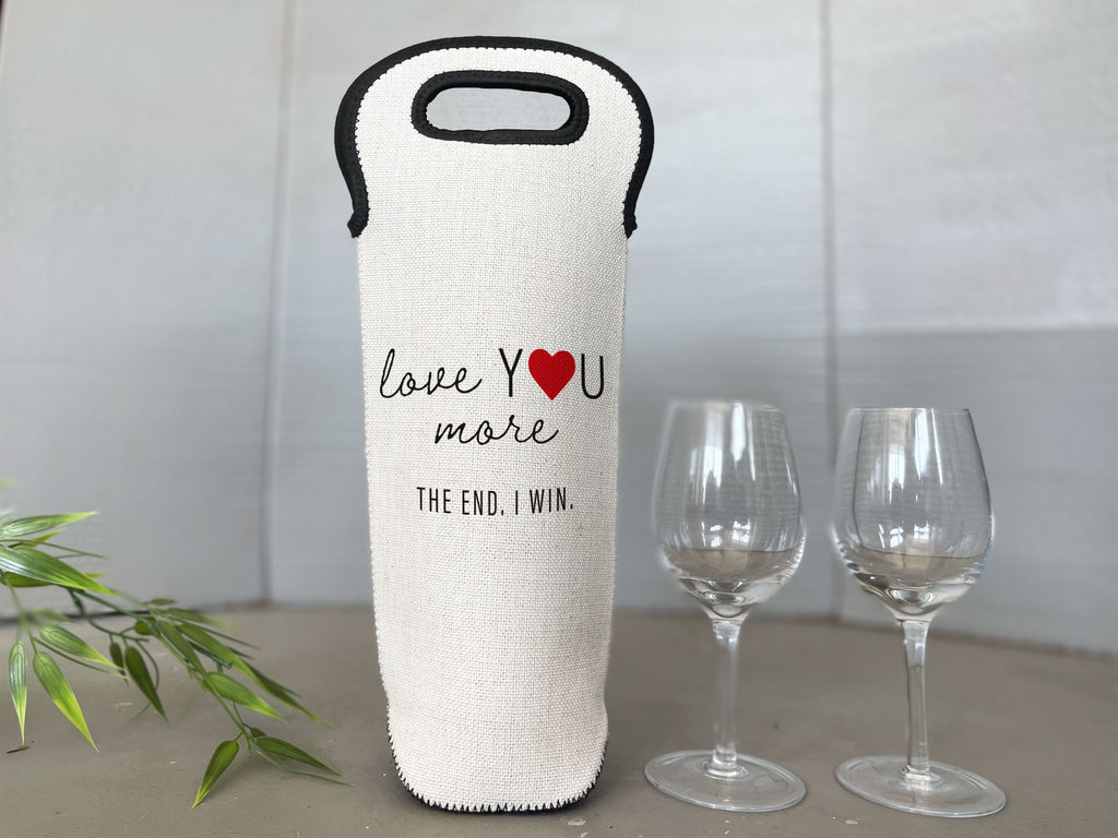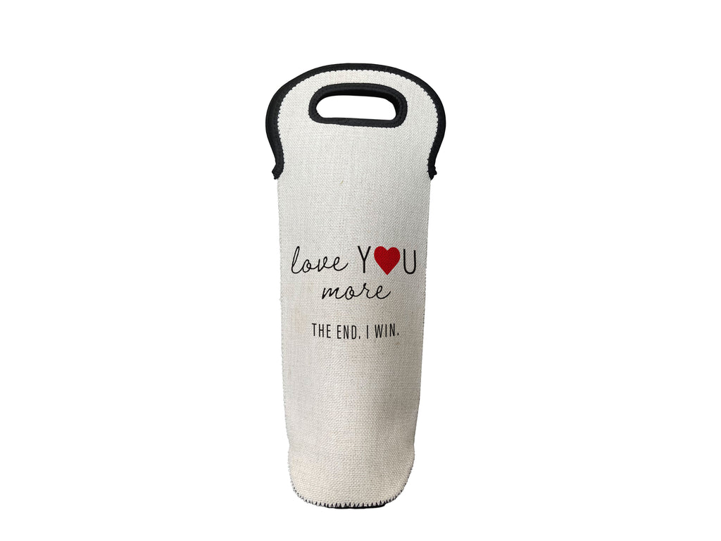 Love You More - The End. I Win. graphic, printed on a faux linen bottle carrier with protective neoprene lining. Printed on both sides.