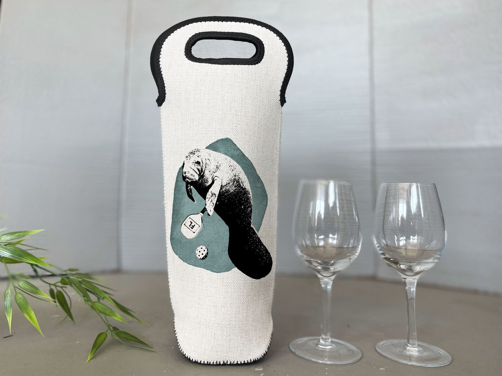 Florida Manatee Playing Pickleball, printed on a faux linen bottle carrier with protective neoprene lining. Printed on both sides.