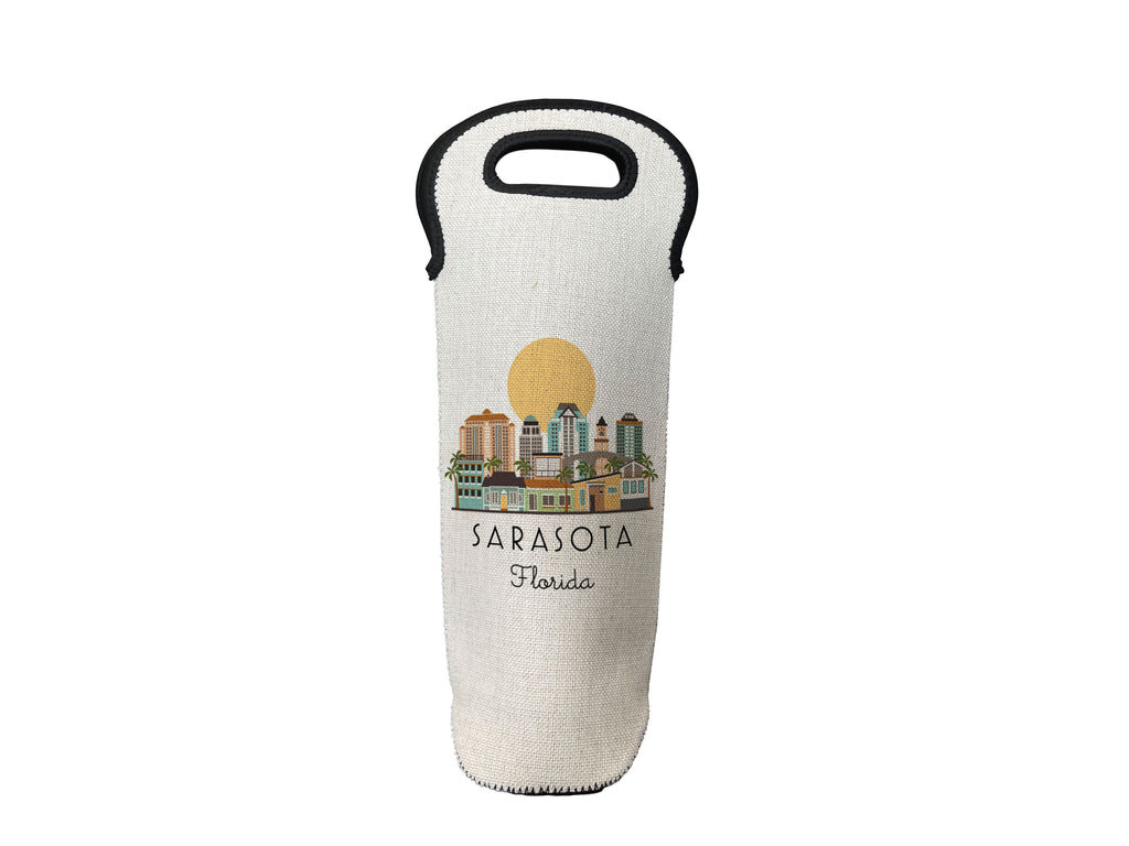 Sarasota Florida Skyline illustration graphic, printed on a faux linen bottle carrier with protective neoprene lining. Printed on both sides.